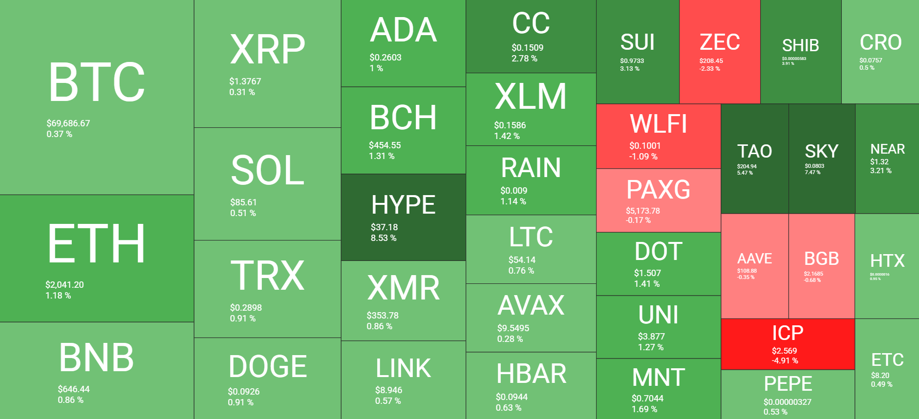 Ethereum managed to maintain its position above the $2,000 mark, while Pi Network’s token has surged following the announcement of its trading launch on Kraken, climbing nearly 5% to reach a peak of $0.24.