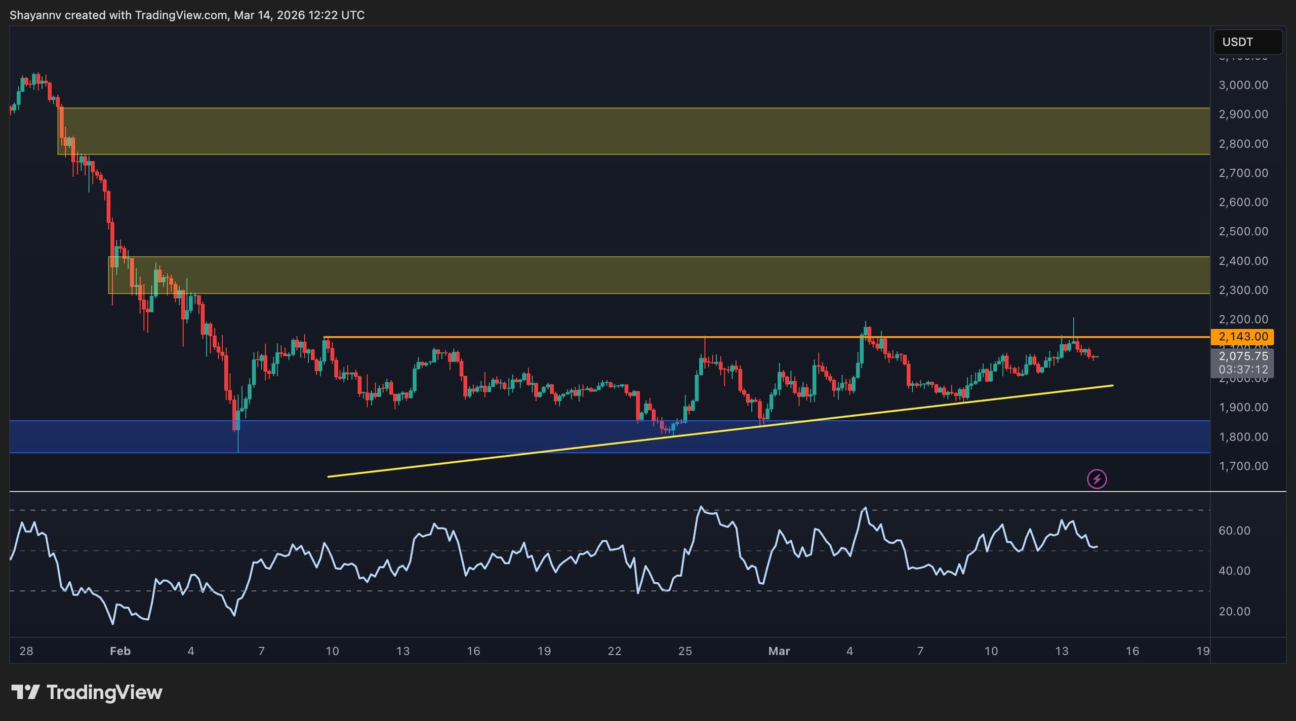 On a 4-hour timeframe, ETH appears to be in a more favorable position compared to the daily chart. The market has been forming a series of higher lows since February, indicating that dip buyers are still engaged. This does not guarantee a breakout but does suggest a constructive upward trend rather than a stagnant one.