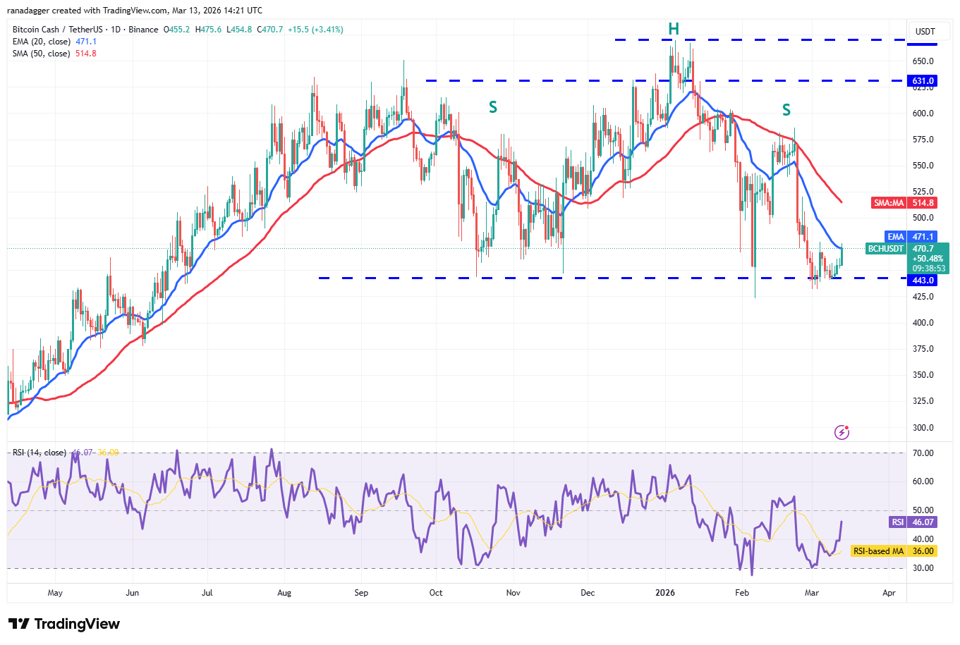 Conversely, if BCH declines from the moving averages, it suggests sustained seller control, raising the risk of dropping below $443 and possibly down to $375.