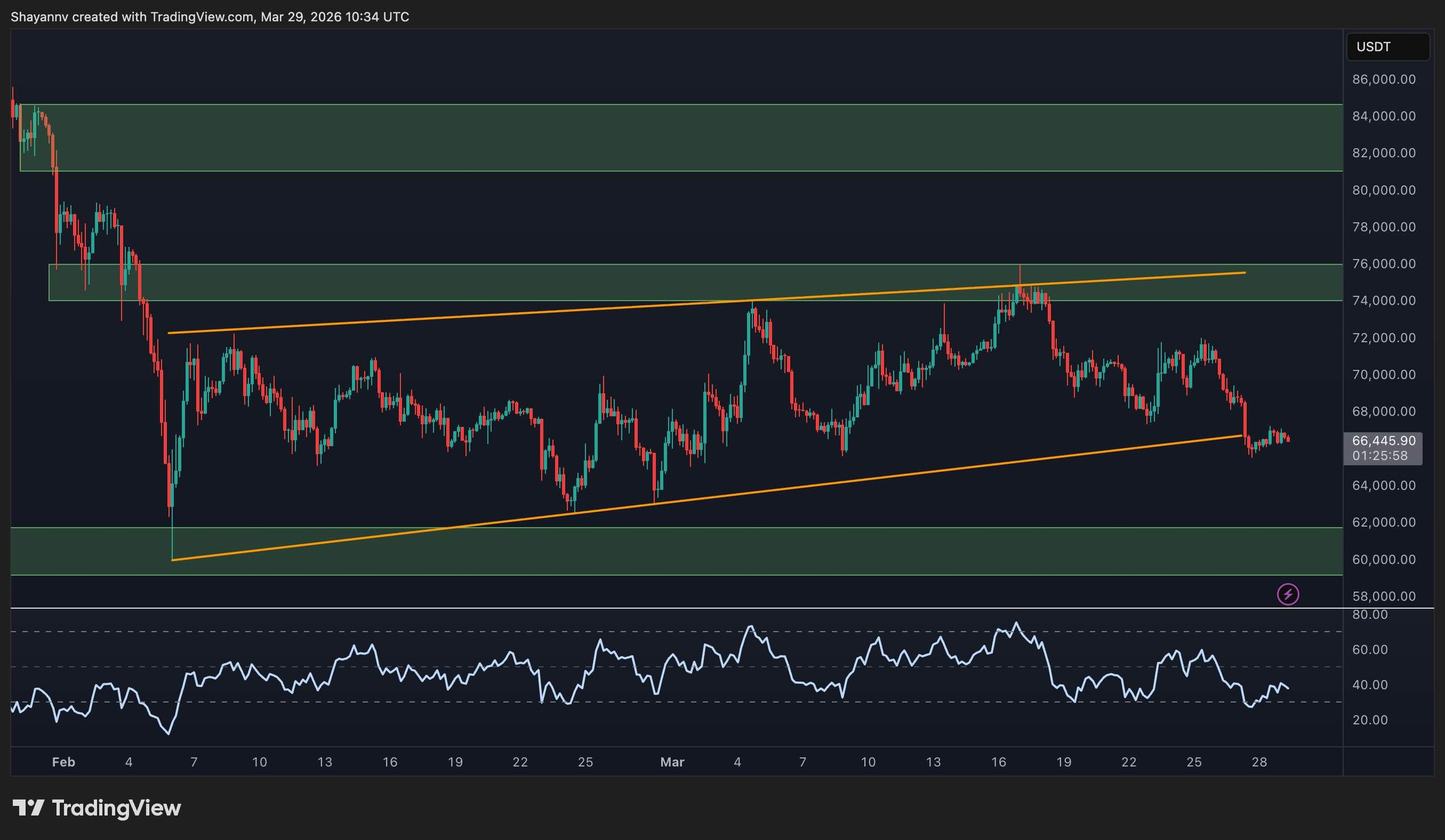 The short-term RSI is approaching oversold conditions following the recent plunge, suggesting that a minor recovery or sideways movement could be on the horizon. However, the ongoing descending trendline and the previously formed bearish imbalances indicate that any upward movement may encounter substantial resistance.