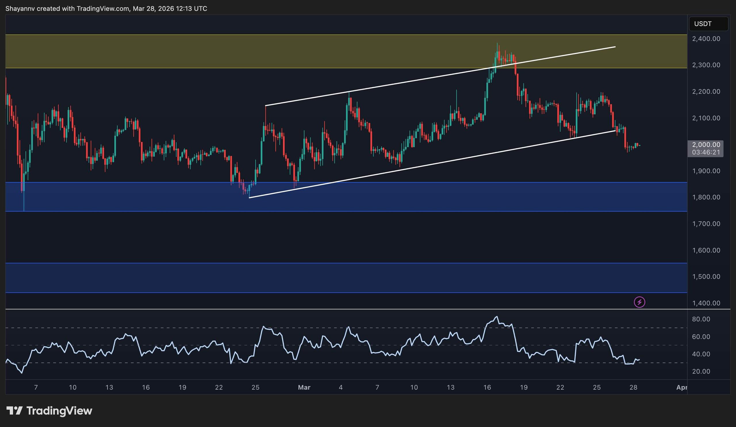 A failed breakout and subsequent rejection at the upper boundary near $2,400 initiated this pronounced pullback, resulting in the asset now hovering around the $2,000 mark, which acts as a short-term pivot. Momentum has significantly cooled, reflected by the RSI’s dip back towards neutral levels.