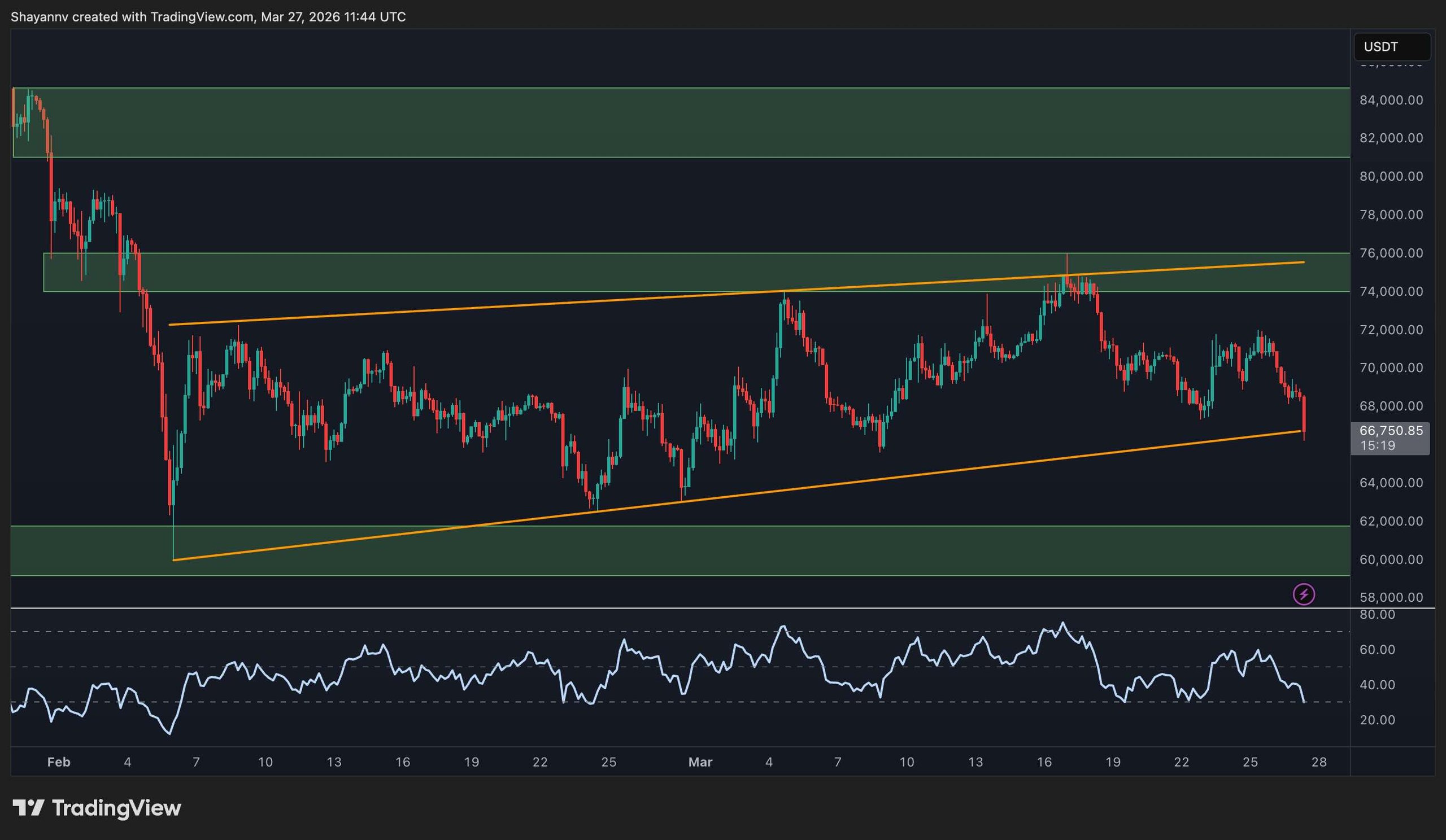 Bitcoin is currently in a precarious position, probing the lower limits of its recent price consolidation after retreating significantly from late-2025 highs. The evolving market structure suggests a potential accumulation zone, though short-term fluctuations are confined within a broadening channel.