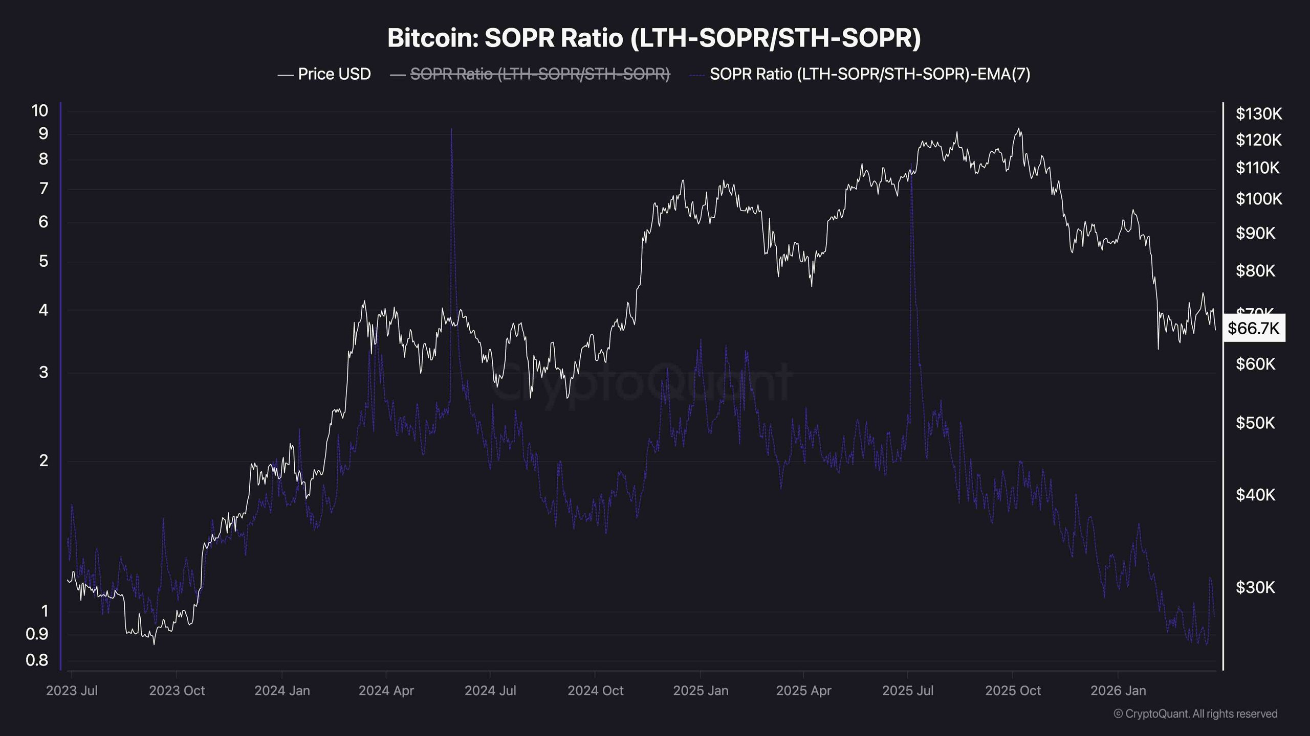 Current on-chain metrics underscore a significant point in this cycle. The LTH-SOPR/STH-SOPR ratio has dipped below one, nearing figures seen during the last market cycle’s accumulation phase in 2023.