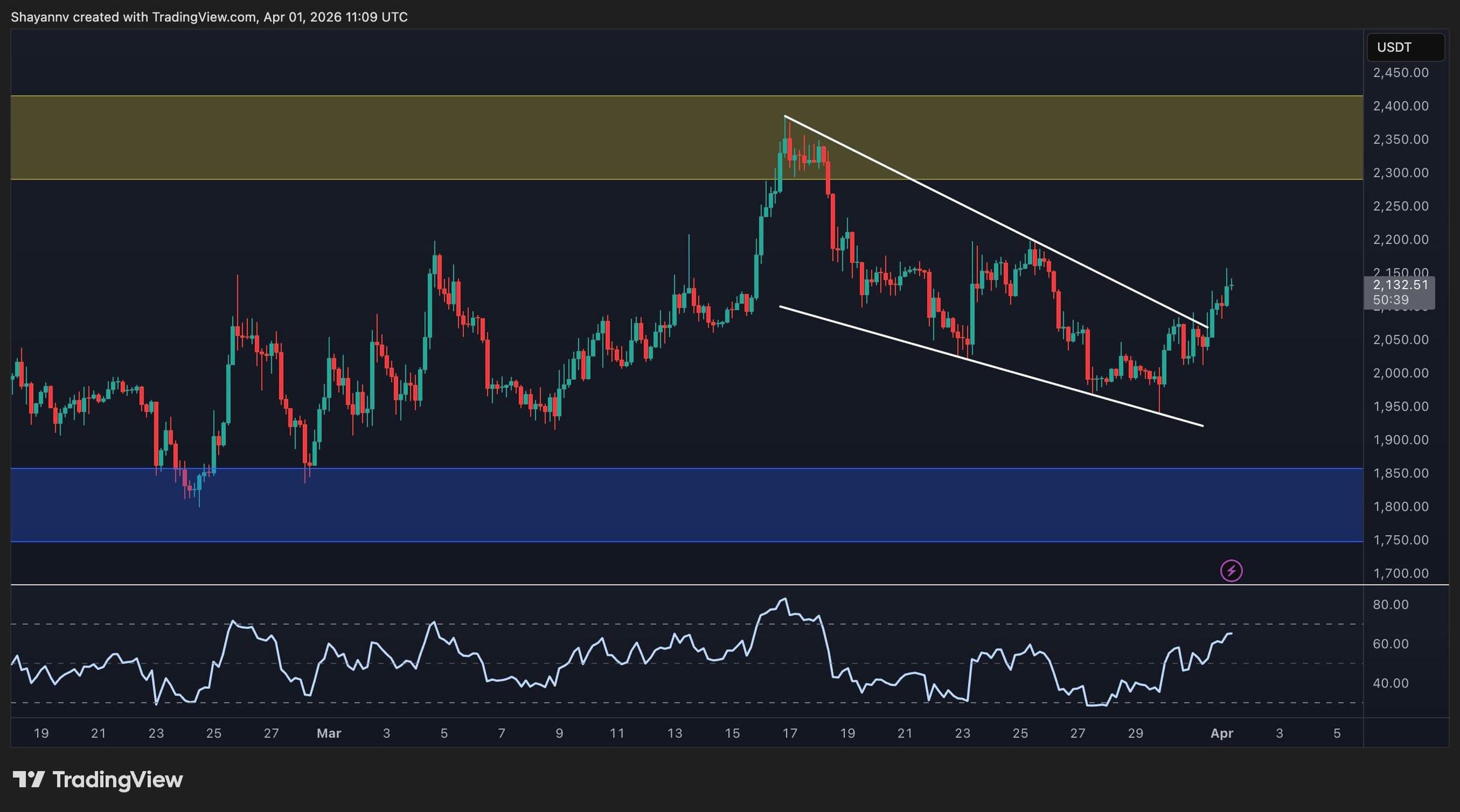 In a shorter timeframe, Ethereum has experienced price movements within a falling wedge pattern since the mid-March rejection at $2,400. Currently, it trades above $2,100 after surmounting the upper boundary of this pattern in recent days. The RSI has surged into the low 70s, signaling a potential short-term rise.