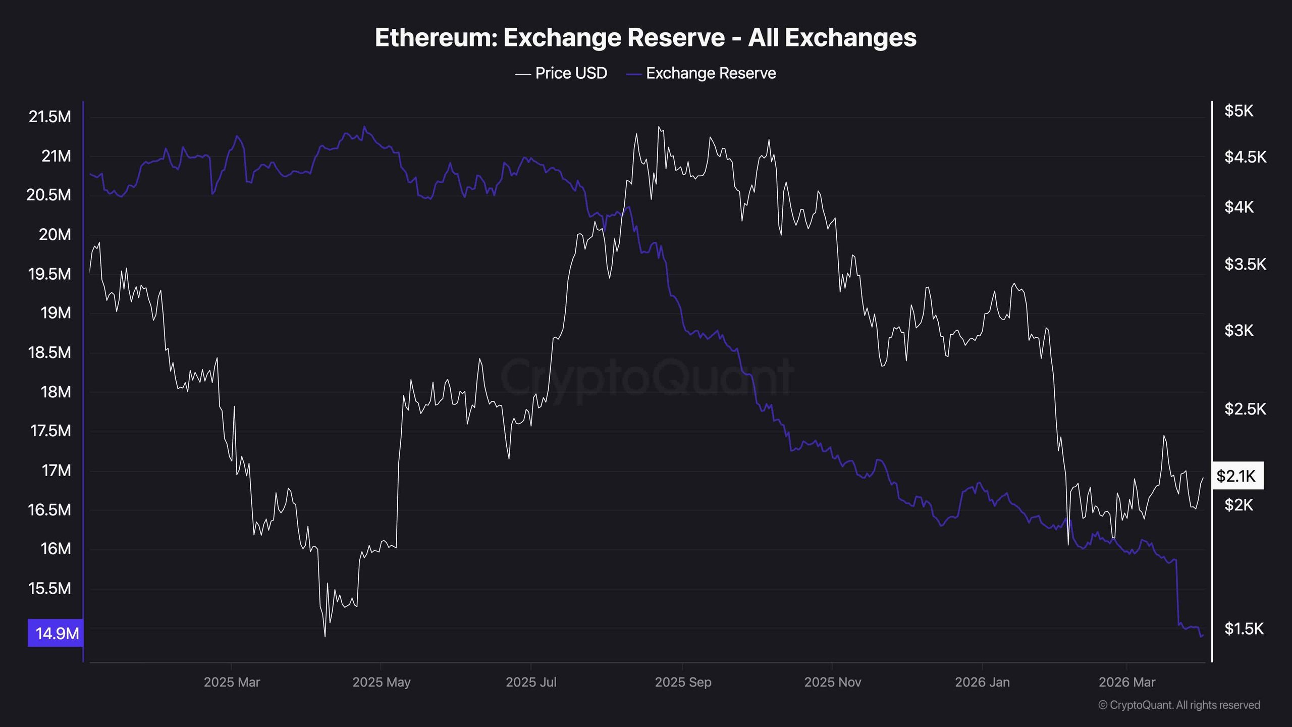 Ethereum’s exchange reserve now sits at approximately 14.9 million ETH, the lowest level seen in the past year, marking a continuing decline that picked up pace throughout late 2025 and into 2026. This represents a significant drop from mid-2025 levels near 21 million ETH and reflects a steady trend of holders extracting ETH from exchanges for self-custody.