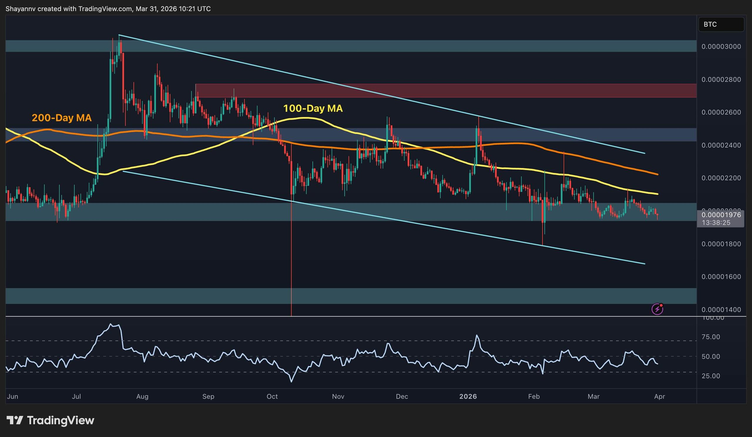 Key support levels lie at the 1,800 sats range, alongside potential lower markers at 1,600 sats and the critical horizontal level at 1,500 sats as far deeper targets. These areas might soon activate if selling pressure intensifies into Q2 2026.