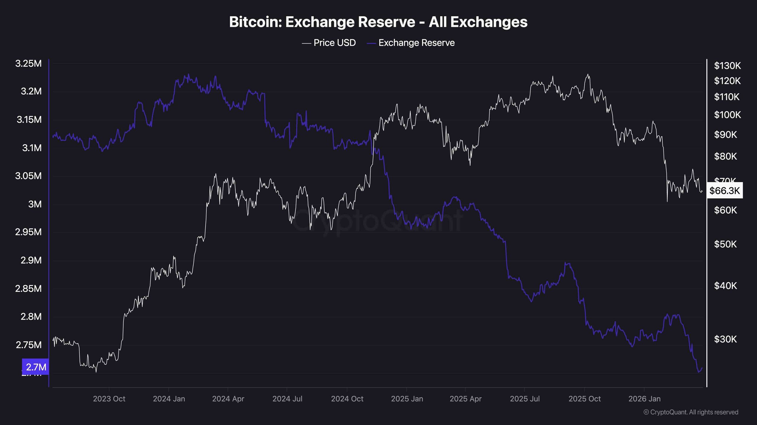 A notable development heading into Q2 is that Bitcoin’s exchange reserves have decreased to roughly 2.7M BTC, the lowest since late 2022. This continuous decline seems to be a sign of long-term holder accumulation rather than an influx of new buyers as prices drop.