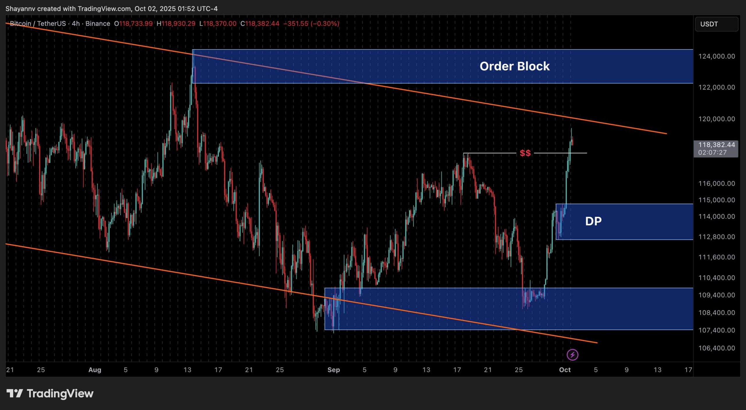 If a pullback occurs, the $114K–$115K demand block will be the key decision point. Sustained bids at this level could fuel another push into the $120K–$124K supply cluster.