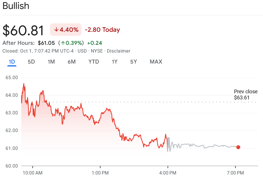 Despite this positive news, Bullish’s shares fell by 4.4%, closing at $60.80 during Wednesday’s trading session, although they still show an increase of over 60% from its IPO price of $37 earlier in August. Bullish’s market capitalization currently stands at $9 billion.