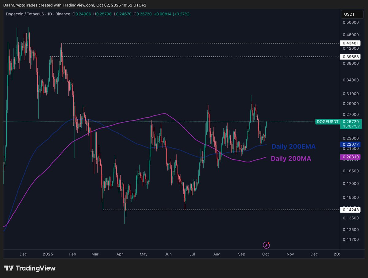 Daan Crypto Trades pointed out that DOGE has established higher lows since the April 2025 low. The cryptocurrency is trading above both the 200-day EMA and MA, signaling dynamic support levels.