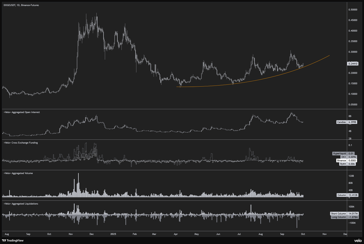 Byzantine General remarked that DOGE is making notable higher lows on the futures chart, supported by a gradually increasing trendline. They voiced,