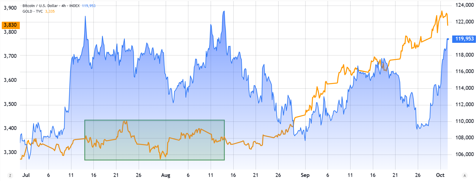 Gold faced stagnation near $3,400 for almost two months until mid-August, during which Bitcoin skyrocketed to its peak. Balancing out the temporary reduction in import tariffs — which ended on August 12 — the impact on the US trade was not significant, thus enhancing inflationary expectations.