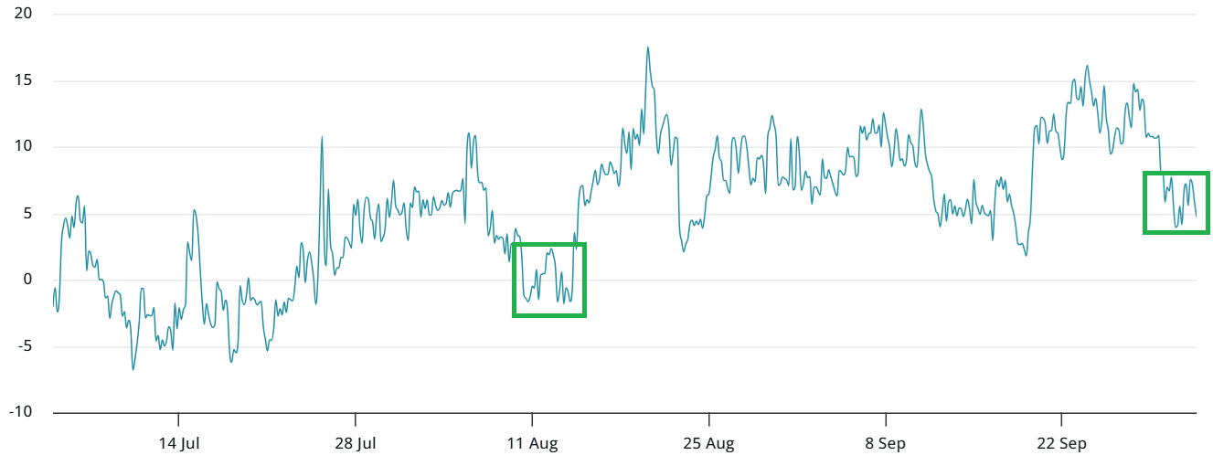 Leading up to Bitcoin’s peak in mid-August, options data illustrated a balanced expectation for price movements. Today, the sentiment indicates a caution towards potential downtrends, with put options trading at a premium over call options.