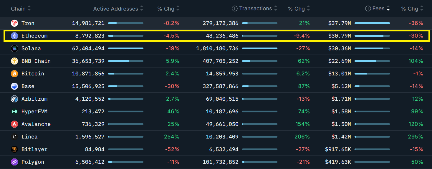 Ethereum’s network fees fell by 30% this past month, along with a 10% reduction in transactions. Conversely, fees for blockchain partners such as BNB Chain and HyperEVM surged, complemented by transaction volume rising by more than 60%. While deposits into Ethereum smart contracts increased by 5% in the same timeframe, the growing competition poses a challenge for Ether to retain its prominent market position.
