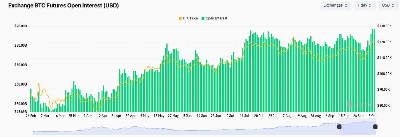 CoinGlass reported an all-time high for total futures open interest across exchanges at $88.7 billion today.