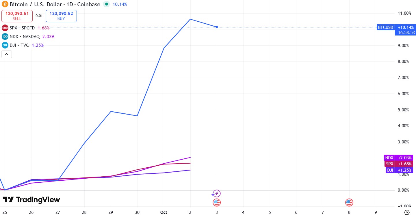 Bitcoin outperforms traditional markets amid a US government shutdown. Source: TradingView