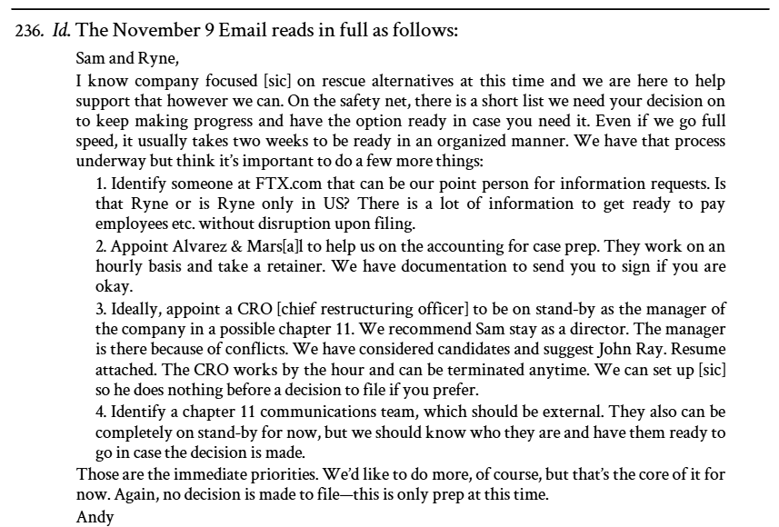 On November 9, 2022, two days before the official bankruptcy filing, attorney Andrew Dietderich from S&C sent an email to Bankman-Fried featuring a plan to appoint Ray as chief restructuring officer during a possible Chapter 11.