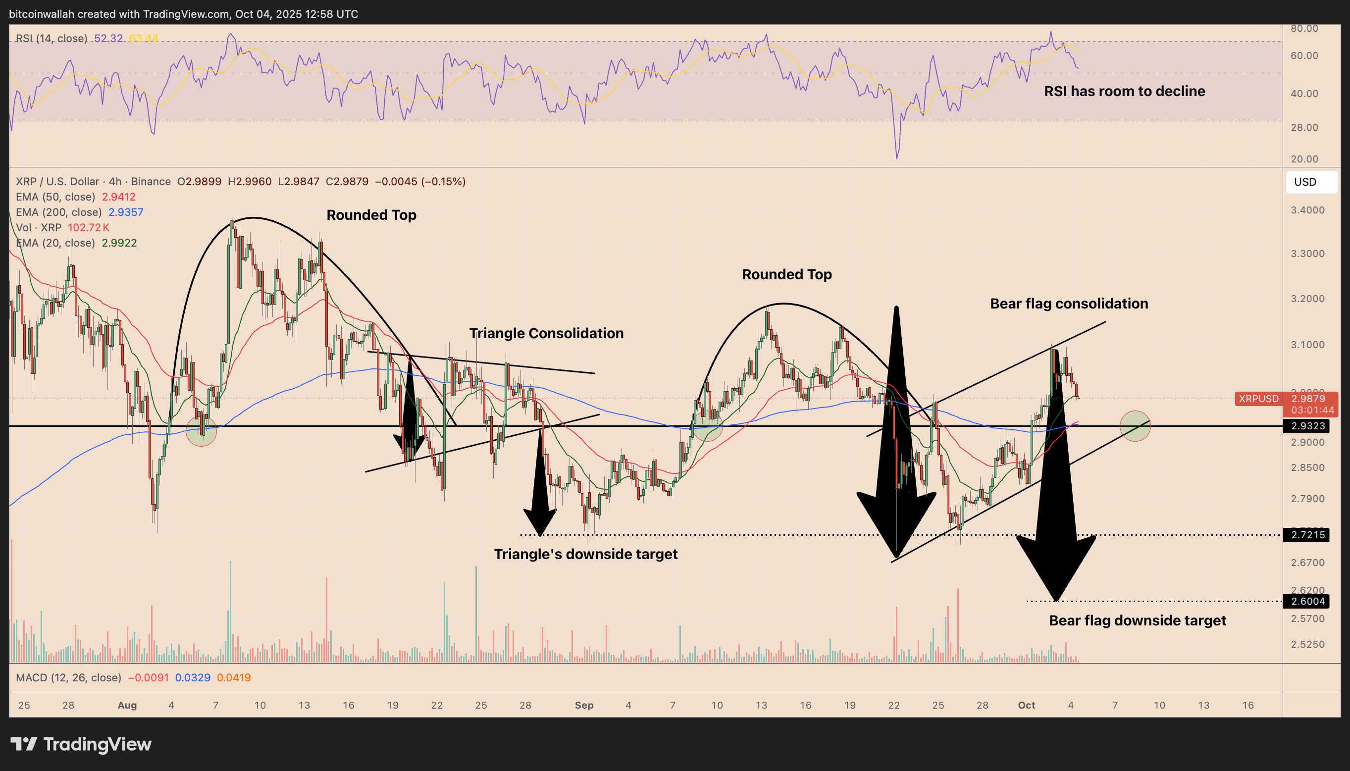 A bearish chart pattern suggests XRP might drop 15% to around $2.60. In September, XRP reached a rounded peak before entering a triangle consolidation pattern and slipping sharply.