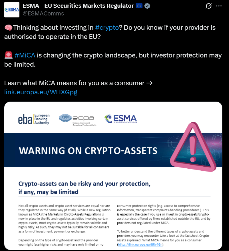 Founded in 2011 as a response to the 2008 global financial crisis, ESMA aims to standardize financial regulations across the EU. MiCA, which takes effect in June 2024, represents the EU’s primary legislative effort to create a uniform framework for digital asset issuers and service providers across its 27 member states.