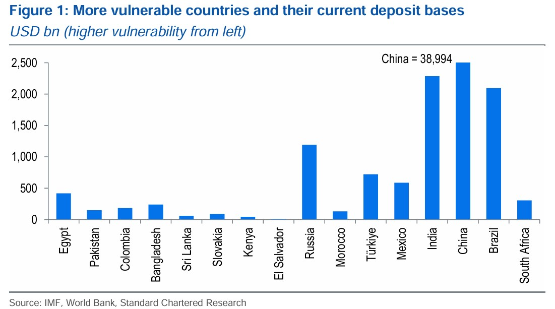More vulnerable countries and their current deposit bases. Source: Standard Chartered