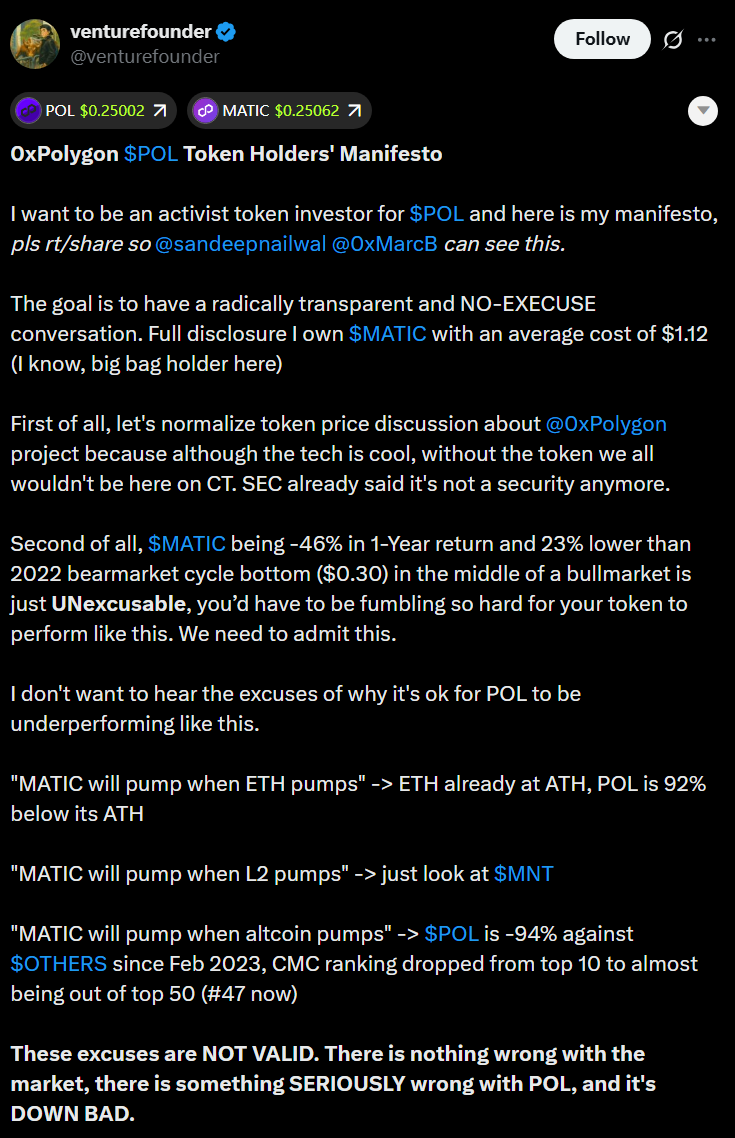 In a recent forum post, Venturefounder highlighted the urgent need for these adjustments, addressing the alarming trend of POL’s ongoing price decline in relation to the overall crypto market.