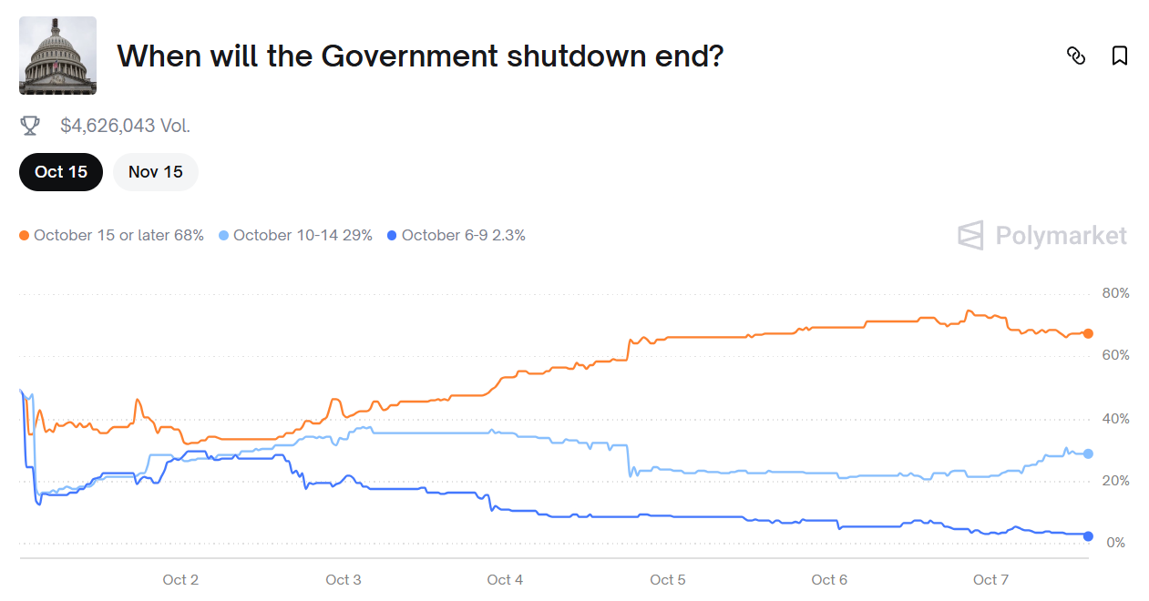 Traders currently assess a 68% probability that the shutdown will conclude by October 15, though negotiations remain at an impasse.
