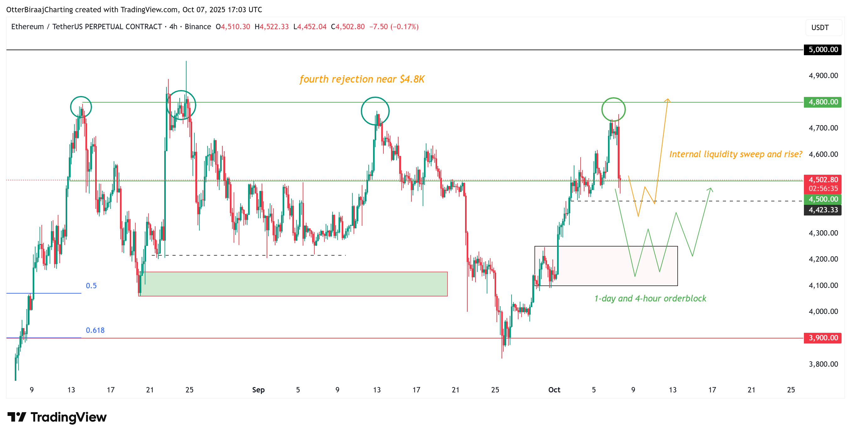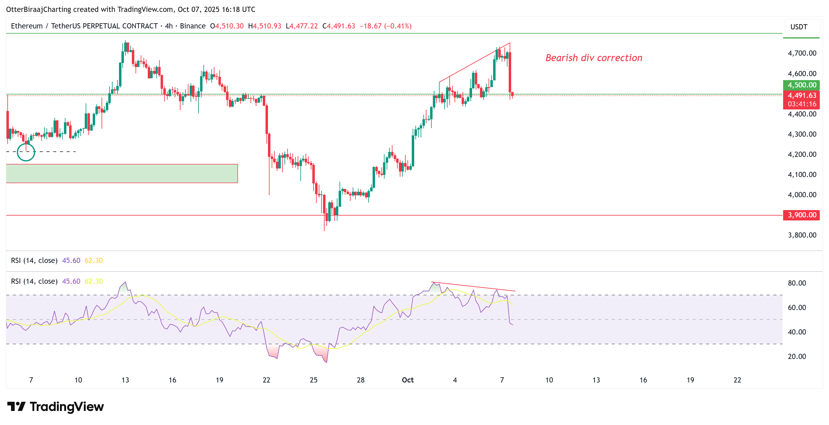 On Monday, Bitcoin (BTC) reached a new all-time high, while Ether (ETH) found it difficult to breach the $4,800 threshold, eventually declining by 3% below $4,500 by Tuesday. This drop followed a bearish divergence observed on the four-hour chart, indicating potential weakness in buyer enthusiasm.