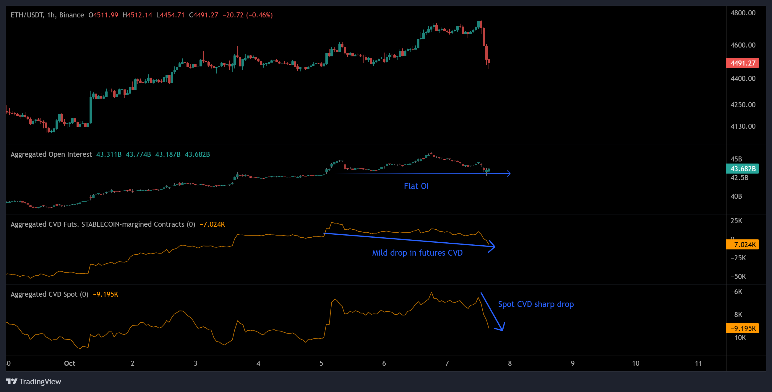 ETH tested the $4,500 threshold again, with mixed signals from on-chain and derivatives data. Despite a pronounced drop in spot cumulative volume delta (CVD), which signals increasing net selling pressure, futures market indicators remain high, suggesting leveraged investors are bracing for price volatility.