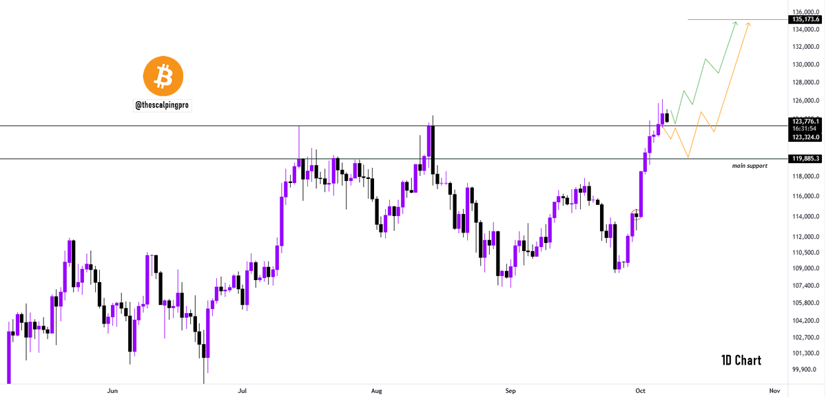 Analyst Mags notes, “BTC has been in an up-only mode, producing just one negative candle over the last 11 days.” Currently, it seems Bitcoin is slightly retreating towards the key $123,300 support level, which, if maintained, could lead to a price increase.