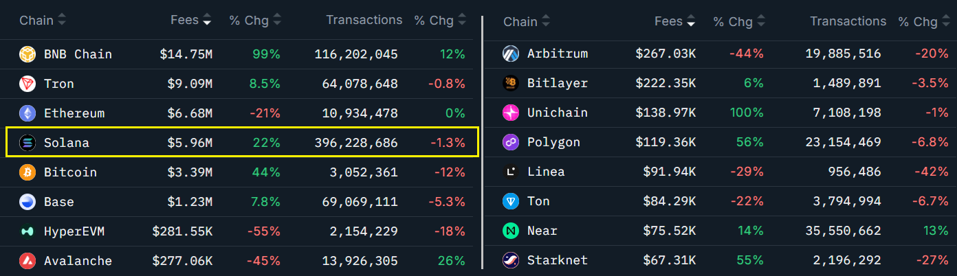 Solana has seen a 22% surge in seven-day network fees, driven by increased activity across decentralized exchanges (DEXs), while its main competitor, Ethereum, faced a 21% decrease in network revenue within the same timeframe. Solana currently leads in transaction count, outperforming the total of both Ethereum and its layer-2 solutions.