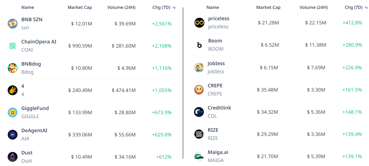 Top 7-day performances of BNB Chain tokens. Source: Cryptorank.io