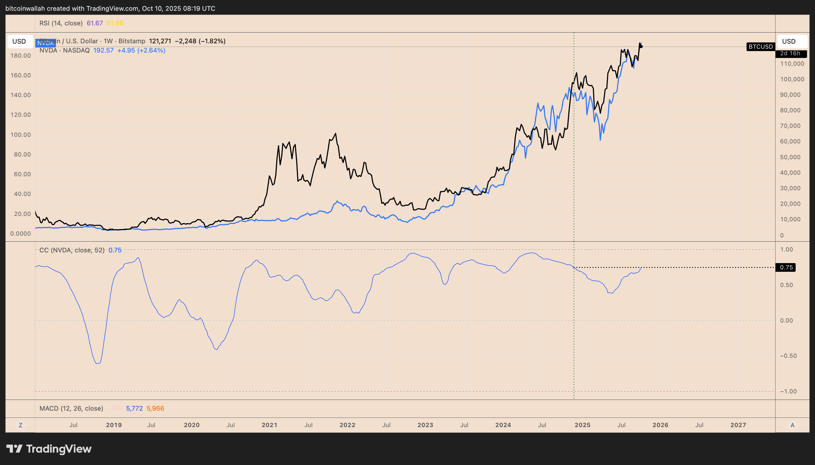 - Bitcoin’s correlation with Nvidia has climbed to 0.75, its highest in a year.
