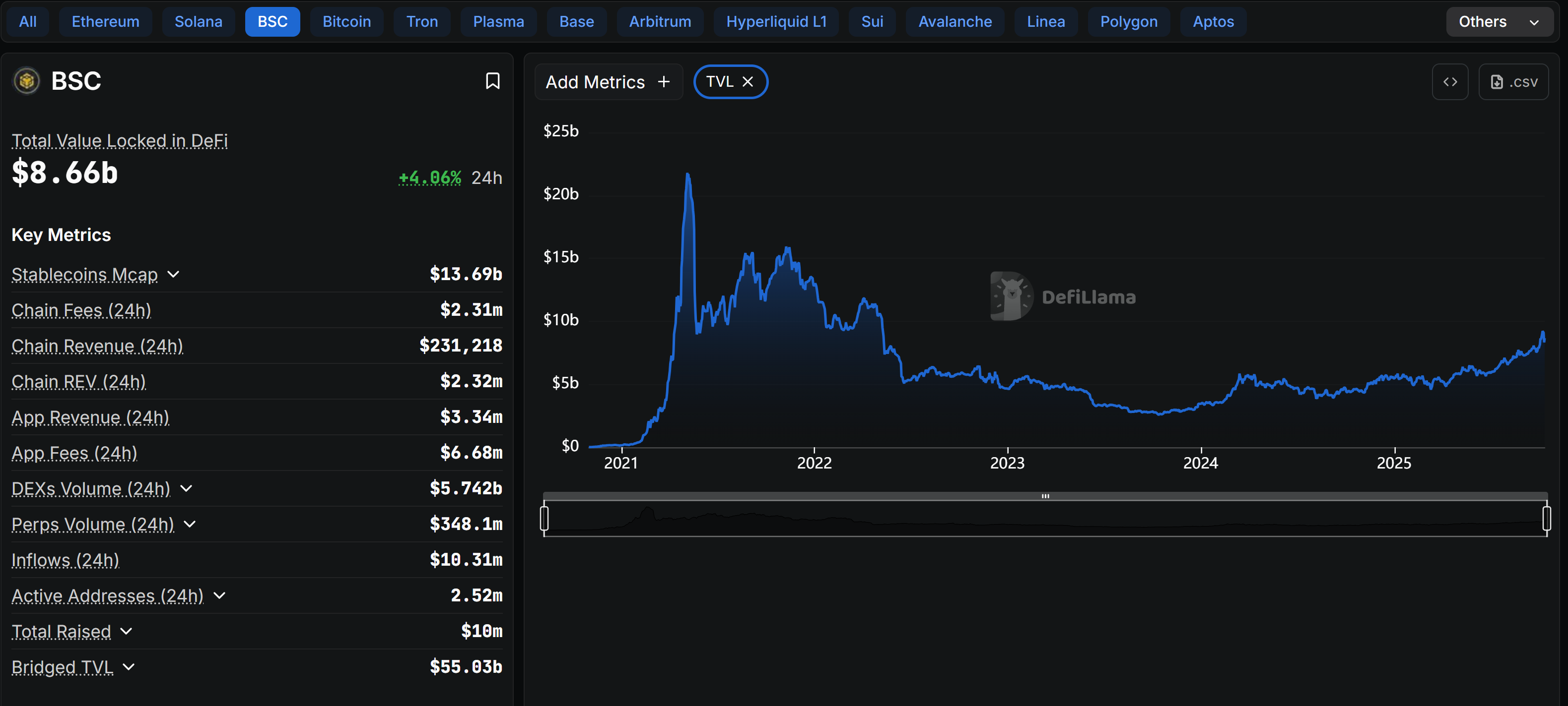 Data from DefiLlama shows that the total value locked (TVL) in BNB Smart Chain stands at approximately $8.66 billion, ranking it among the top three blockchains with 2.52 million active users and more than 20.7 million transactions occurring in a single day.