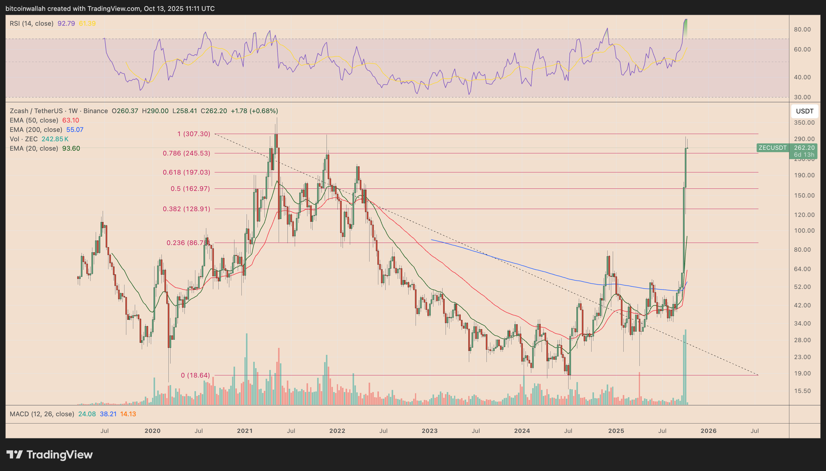 Currently, Zcash is at historically high overbought levels according to its weekly chart, which could prompt a short-term reversal.