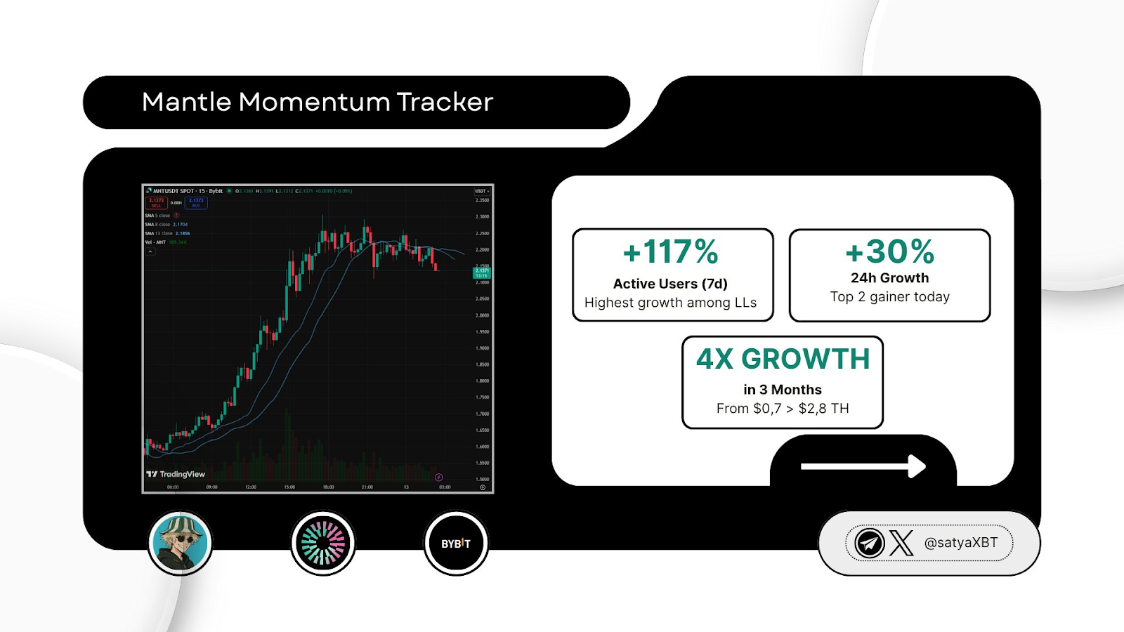 Mantle’s active user accounts jumped 117% week-over-week, marking a strong upward shift among layer-2 solutions, per the blockchain analyst SatyaXBT. This surge signals a productive relationship developing between centralized exchanges like Bybit and layer-2 networks.
