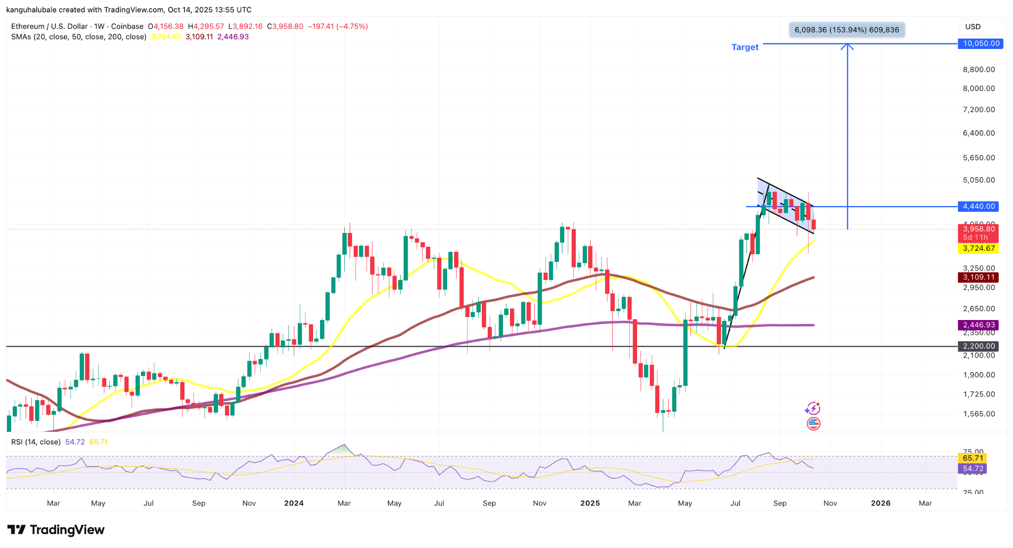 The analysis shows that Ether is forming a bull flag pattern, indicating that a breakout could push its price to approximately $10,050, marking a 164% increase from current values. However, failing to stay above the $3,800 mark may trigger further declines.