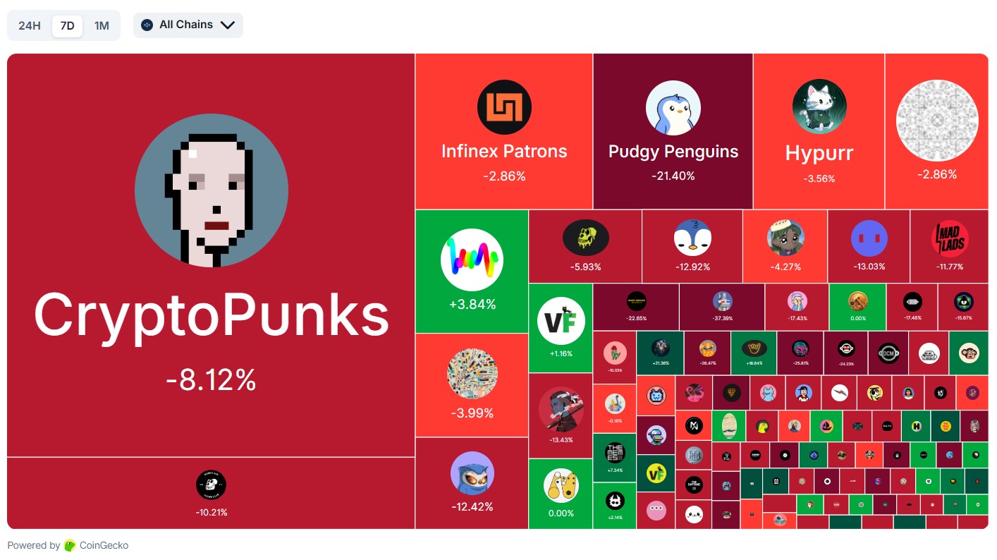 CryptoPunks, the market leader in NFT valuation, is currently down 8% for the week and nearly 5% over the past month.