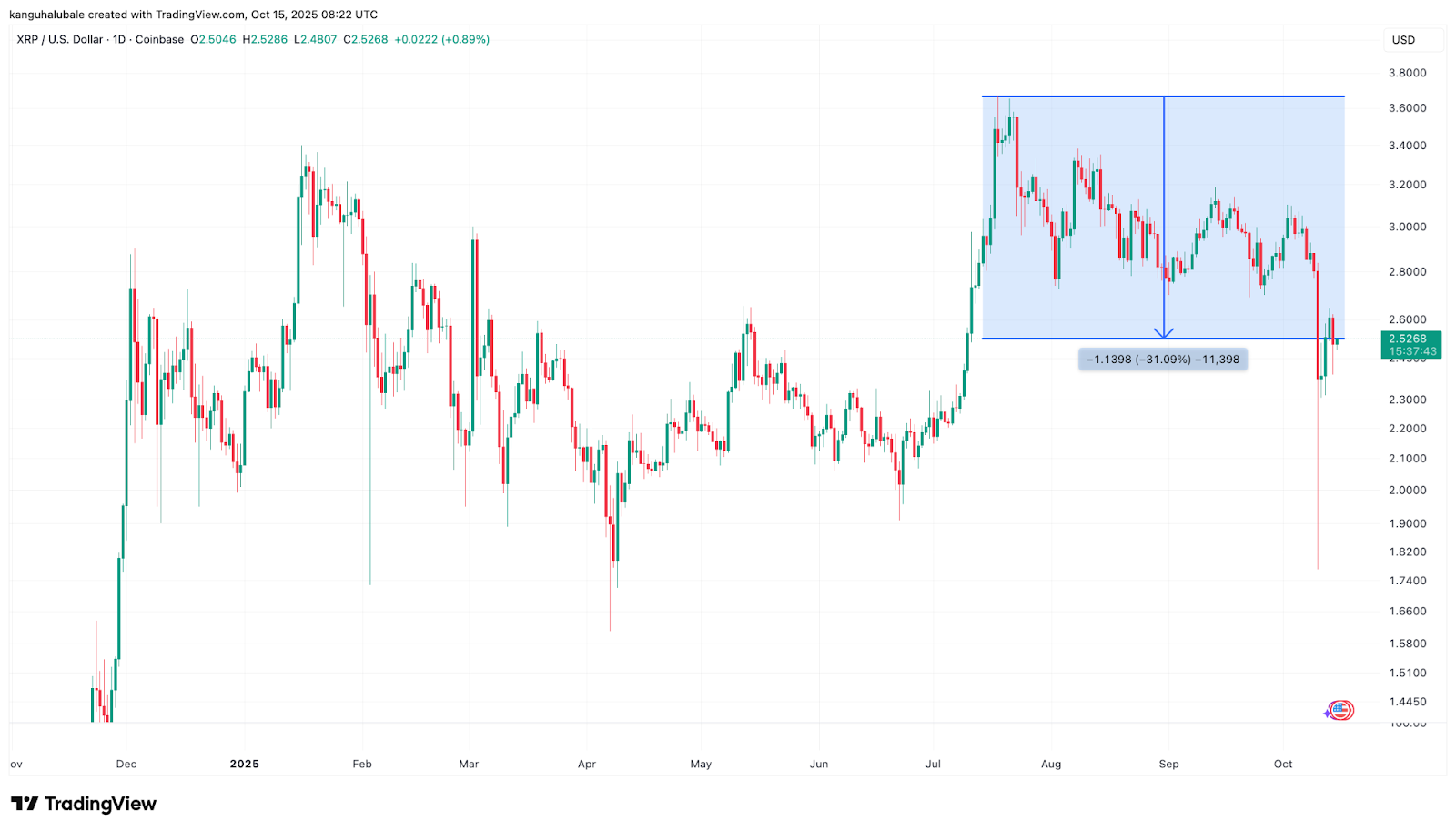 XRP has faced a significant downturn of over 31% since reaching a peak of approximately $3.66 in July. This decline includes a 12.5% decrease in the past week, bringing its price down to $2.50.
