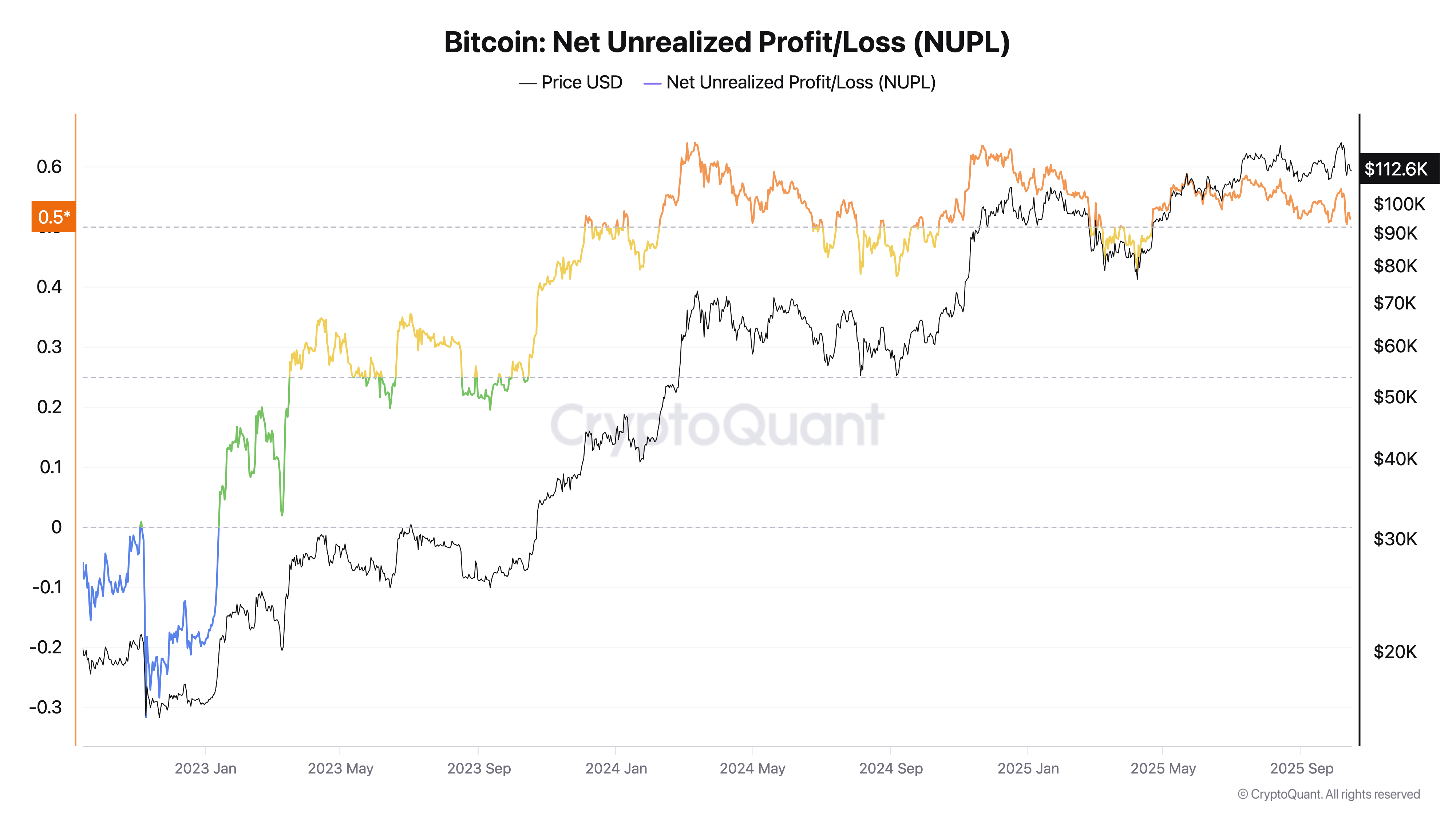 CryptoQuant’s data shows that the unrealized profit and loss (NUPL) ratio has moved into a zone that historically corresponds with significant market peaks.