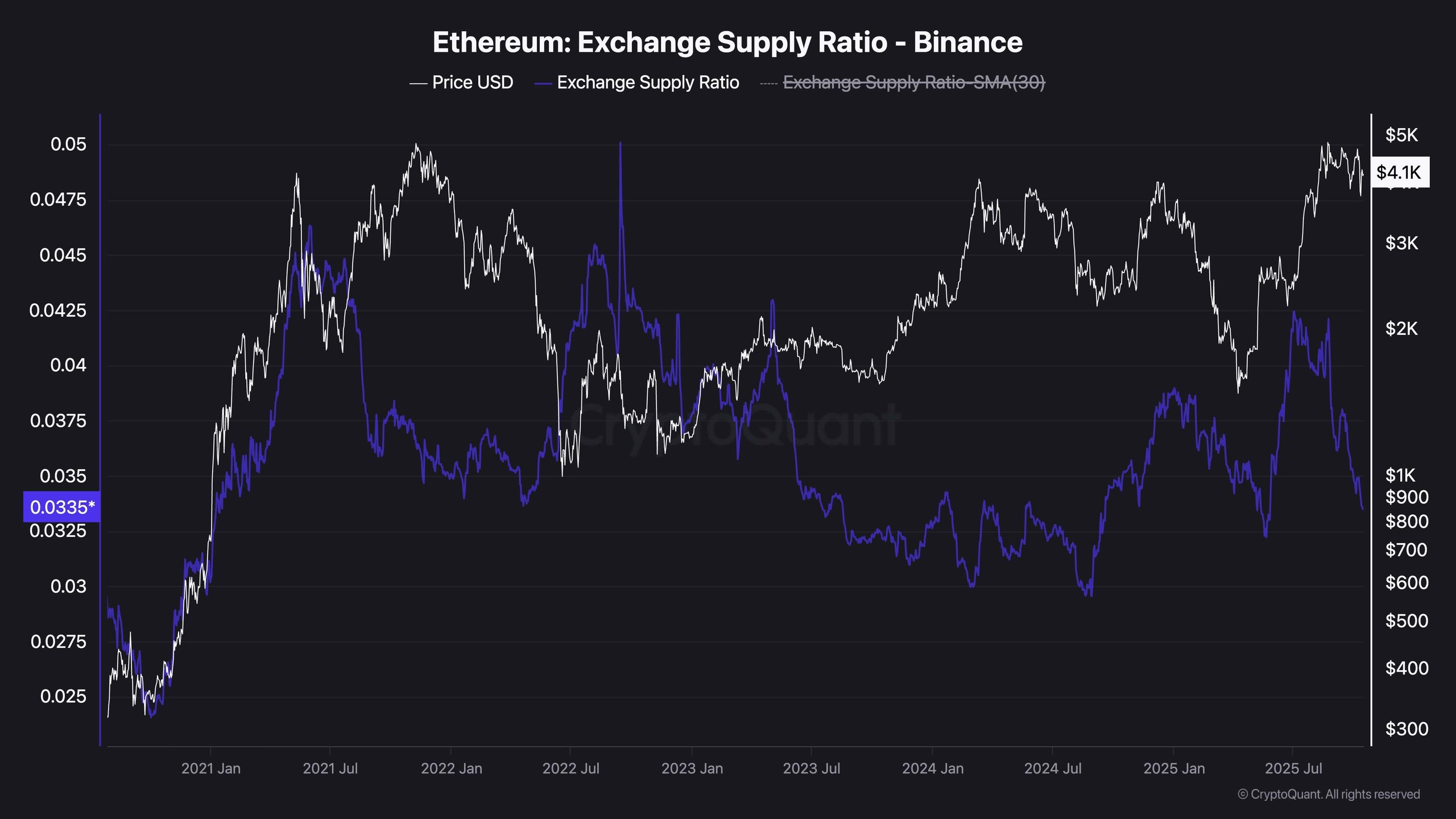 Data from Binance reveals a sharp decline in ETH’s supply ratio on exchanges, now at 0.33, nearing its lowest since May. This drop follows a brief increase in exchange balances while Ethereum steadied around $4,000.