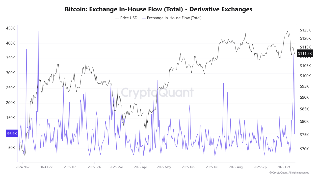 From October 9 to 14, approximately 364,000 BTC were mobilized within internal wallets of derivatives exchanges like Bitfinex (210,000 BTC), Bybit (108,000 BTC), and Binance (37,000 BTC). This activity indicates traders are preparing to engage with significant leveraged positions.