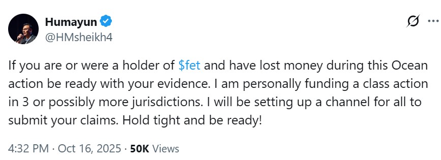 Sheikh also announced intentions to finance class-action lawsuits across multiple jurisdictions and urged Binance, GSR, and ExaGroup to investigate. Moreover, he called upon FET tokenholders to compile evidence against Ocean Protocol, stating he would establish a channel for them to submit their claims.