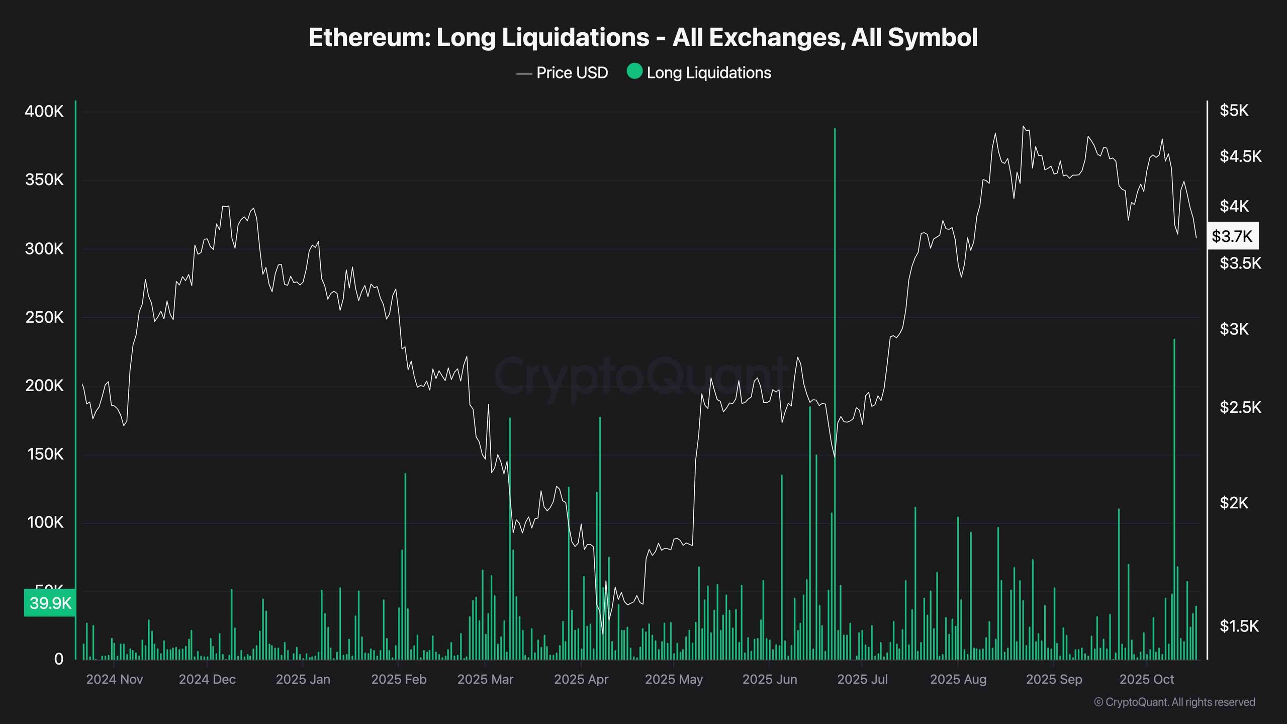 The recent decline in Ethereum’s price has resulted in a significant surge in long liquidations across exchanges, marking it as one of the notable deleveraging events observed in recent memory. This unprecedented selling reflects how many long traders were unexpectedly caught off guard by the market’s rapid shift. Historically, such liquidation spikes often appear near local lows, yet the scale of this drop implies heightened panic among retail traders, while institutional investors seem to be adopting a wait-and-see approach for more definitive market signals before reinvesting.