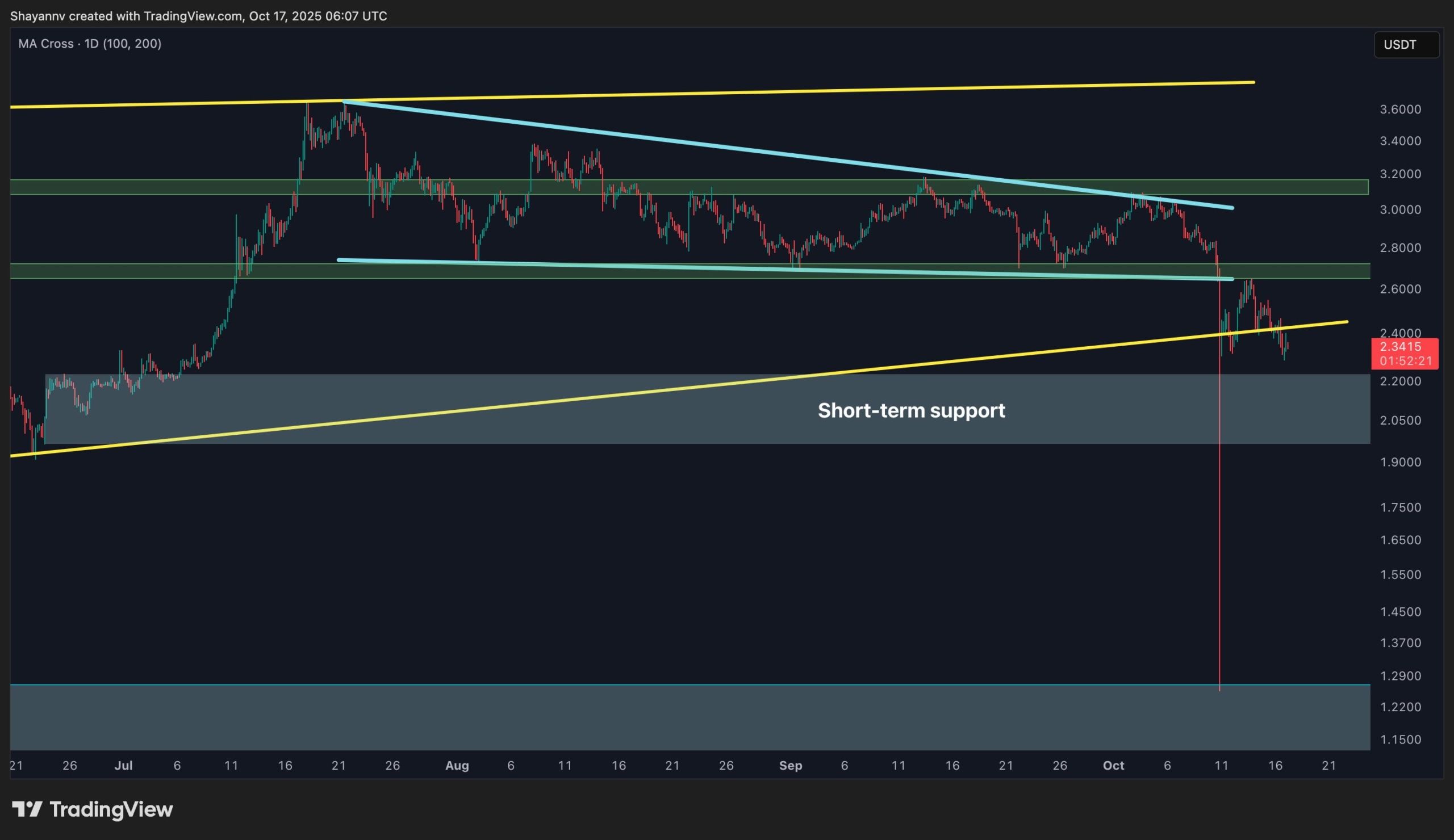 Currently, XRP trades around the $2.3 area, coinciding with the 200-day MA and the lower boundary of a wedge pattern. This zone is vital and may act as a final line of defense before a potential revisit to the institutional demand zone between $2 and $1.3, where significant long-term accumulations were made earlier this year.