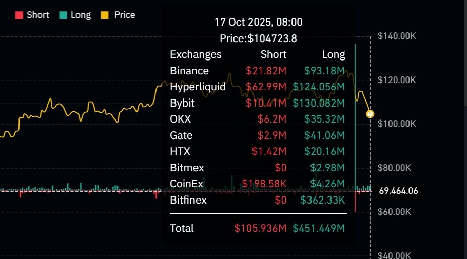 - Bitcoin (BTC) has faced a nearly 6% drop to approximately $105,000.