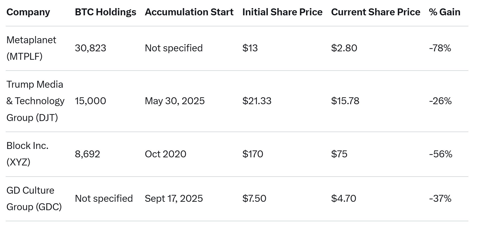 - Trump Media & Technology Group (DJT), which begun its accumulation of 15,000 BTC in May 2025, encountered a drop from $21.33 to $15.78 (-26%).