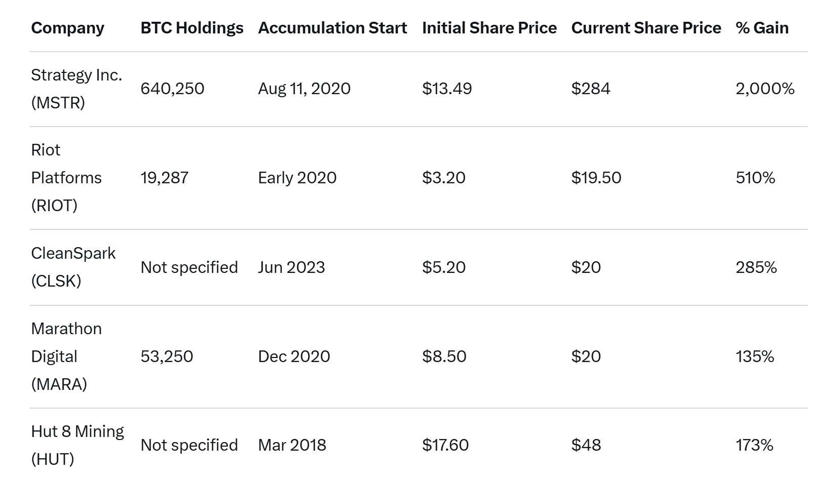 Companies gaining over 100% in stock value since BTC accumulation. Source: BitcoinTresuries.net/Cointelegraph