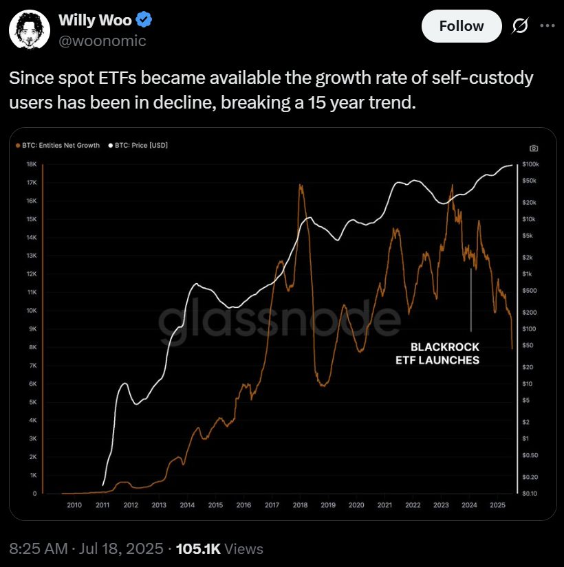 While these ETFs do not necessarily compete with direct holdings, as they cater to distinct investor categories, Willy Woo remarked in July that ETF interest might be diverting attention from self-custody. Recent on-chain data reveals a downturn in self-custodied Bitcoin after 15 years of growth, indicating a significant potential change in investor behavior.