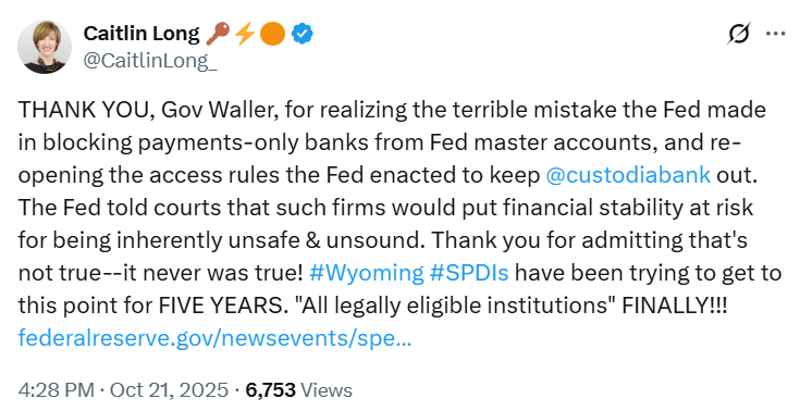 “THANK YOU, Gov Waller, for recognizing the severe error the Fed made in blocking access to master accounts for payments-only banks and for revisiting the Fed’s restrictive policies that prevented @custodiabank from participation.”