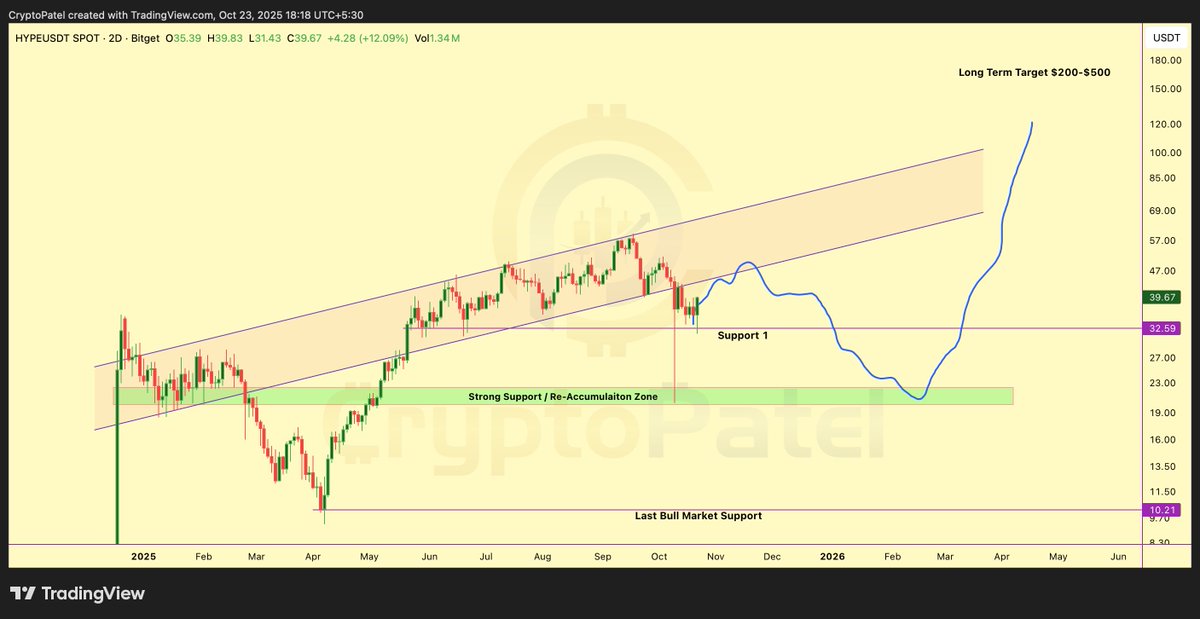 Analyst Crypto Patel has also set a target above $50, noting this mark corresponds with the lower boundary of HYPE’s previous upward channel.